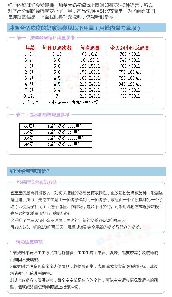 冲调方法:每勺奶粉60毫升水,请用40摄氏度的温开水,以免破坏营养成分,先加水,后加奶粉,然后摇匀。以尽量避免结块。切勿用微波炉加热牛奶,以免烫伤宝宝。