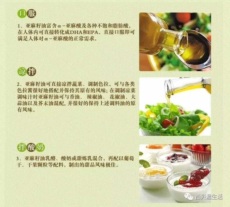 低温烹饪:为避免破坏营养成分,亚麻籽油不要高温加热,加热也不要加热过久