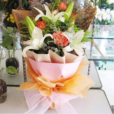 花材: 白色多头香水百合3枝,粉色玫瑰6枝