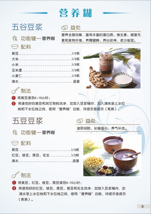 更多功能选择;干豆、湿豆、米糊、营养糊、果蔬料理五个功能