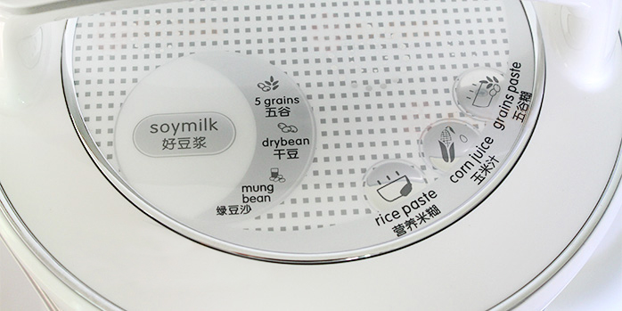 九阳CTS-1098S属于九阳五谷精磨系列豆浆机,它操作面板上有3个直接的功能按键,分别是营养米糊、玉米汁、五谷糊;还有1个好豆浆(soymilk)按键,有3中食谱功能供选择,分别是五谷、干豆、绿豆沙。