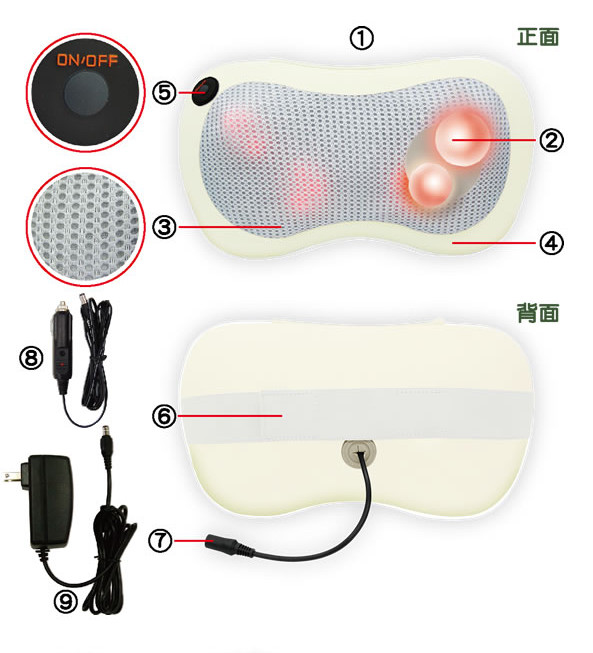 ◇主体按摩枕×1、说明书×1、家用电源器×1、车用电源器×1